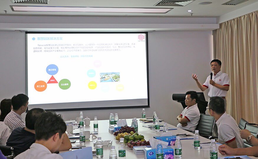 杰创智能董事长孙超首先对陈东市长等领导的到来表示热烈的欢迎,然后向各位领导介绍了公司的发展历程、研发团队、核心产品和技术、经营业绩、发展战略等方面的情况。