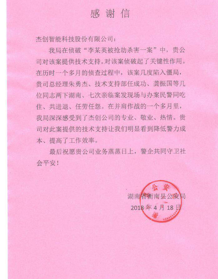 近日,湖南省衡南公安局发来感谢函,对杰创智能在近期协助侦破“李某英被抢劫杀害一案”表示感谢,目前相关犯罪嫌疑人已被依法刑事拘留,案件正在进一步侦办中。